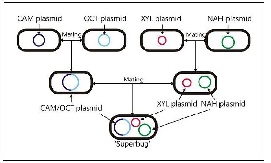 أحياء مهندسة وراثياً تم تشكيلها لمكافحة التلوث النفطي اذ تحوي مجمع من الجينات في سلالة واحدة في بكتريا Pseudomonas التي توجد أنواع منها كثيرة تحلل مركبات نفطية معقدة كما موضح في الشكل الآتي :