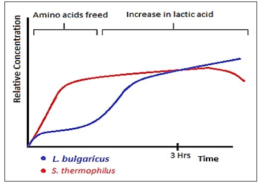 ومن الصناعات الحيوية المعتمدة على هذه العلاقة هو إنتاج اللبن حيث تتكافل بكترياLactobacillus bulgaricus مع Streptococcus thermophilus لإنتاجه ، ووجودهم مع بعض يؤدي إلى زيادة الحموضة وبالتالي الحصول على المنتوج بأسرع وقت، وفي هذه العلاقة التكافلية تنتج العصيات بعض الحوامض الأمينية التي تحفز المسبحيات ويمكن إيضاح علاقة التكافل بين الأحياء أثناء إنتاج اللبن بالشكل الآتي :