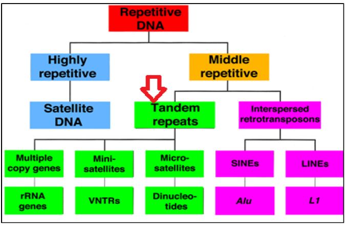 عائلة من تواليات DNA التي تشمل تكرار تواليات خاصة من القواعد النتروجينية التي تكون متجاورة وموقعها موضح في خارطة مكررات DNA في الشكل الاتي :