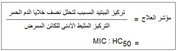 ويمكن ان يحسب من مؤشرات اخرى كما في قياسه بالنسبة للبتديدات المضادة للاحياء الممرضة ، اذ يتم حسابه بالاعتماد على مدى قابلية الببتيدات على تحليا كريات الدم الحمر ، كما في المعادلة الاتية :