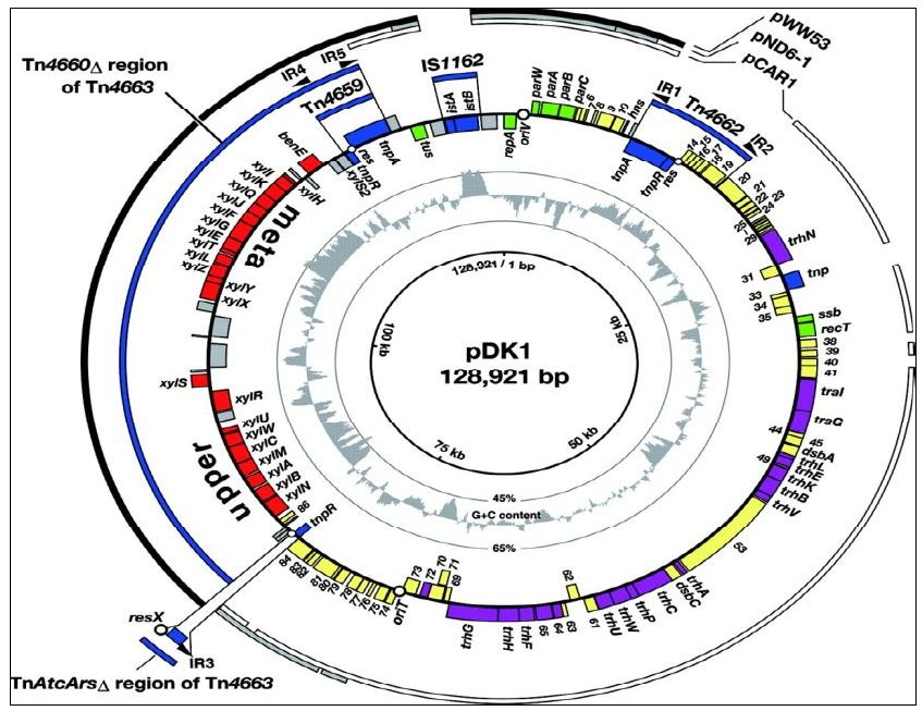 بلازميدات مسئولة عن تفكيك المذيبات العضوية مثل Xylenes , Toluene،عزل من البكتريا Pseudomonas putida ، يمكنها الانتقال من سلالة الى اخرى أي انها من البلازميدات الاقترانية Conjugative Plasmids ، وتعود الى المجموعة غير المتوافقة IncP- 9 . وهذه القابلية جعلت هذه المجموعة من البلازميدات مهمة في معالجة التربة الملوثة، خاصة وان البكتريا التي تحملها غير ممرضة وشائعة في التربة ، وتساعد البلازميدات الخلايا في تكوين الاغشية الحيوية السميكة والالتصاق وزيادة كمية eDNA الخارجي .