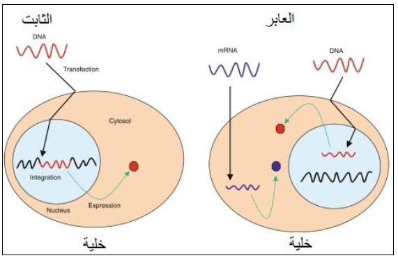 احدى حالات نقل مواد وراثية غريبة الى الخلايا حقيقية النواة ، والنقل يقسم الى حالة عابرة وثابتة . في العابرة يدخل DNA الى الخلايا المراد تغييرها ويبقى DNA مدة من الزمن دون ان يندمج مع جينوم الخلية وينتهي تاثيره بعد مدة قصيرة ، ويكون التعبير عن المواد المدخلة فقط في الخلايا التي استلمتها ولمدة قصيرة وتستعمل للكشف عن كيفية تاثير التحويرات الوراثية في وظائف بعض الجينات ، في الحالة العابرة يمكن ان يفقد الجين في وقتتعتمد على العوامل البيئية ويفقد اثناء عملية الانقسام الخيطي للخلايا والخلايا الناتجة لا تحتفظ بالمواد المدخلة ،واذا اريد الاحتفاظ بالمواد المدخلة فلابد من حدوث حالة الاندماج الثابت اذ انه في الحالة الثابتة يبقى تاثيره لمدة طويلة لان المادة الوراثية المدخلة تندمج مع جينوم الخلية وتظهر في الاحفاد .