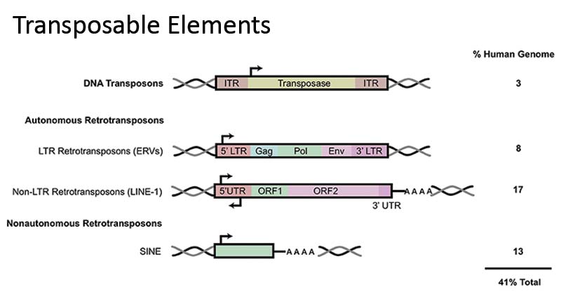 - بعض العناصر تبقى في حالة سكون في الجينوم ويمكن إعادة تنشيطها ببعض الوسائل الحيوية او غير الحيوية وهذه الحالة يطلق عليها الإجهاد الجينومي Genomic Stress.
