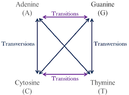 طفرات استبدالية نقطية وفيها تحل قاعدة بيورينة ذات الحلقتين مكان قاعدة بيريميدنية ذات الحلقة الواحدة او العكس .