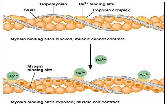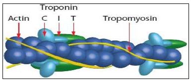 معقد بروتيني مكون من ثلاث بروتينات هي Troponin T و Troponin I و Troponin C ويرتبطون ب Tropomyosin، ويكون على شكل خيوط رفيعة تساعد في تقلص وارتخاء العضلات وتكون ضرورية في تقلص العضلات الهيكلية والقلبية والملساء ، واحد هذه الخيوط يعمل كمستلم يرتبط الى الكالسيوم التي تتداخل مع Myosin وتسبب التقلص . يعمل على تنظيم ضربات القلب ويستعمل كدليل على الاحتشاء العضلي القلبي Myocardial Infarction لانه في هذه الحالة تنضح البروتينات الى مجرى الدم مما يشير الى الاحتشاء .