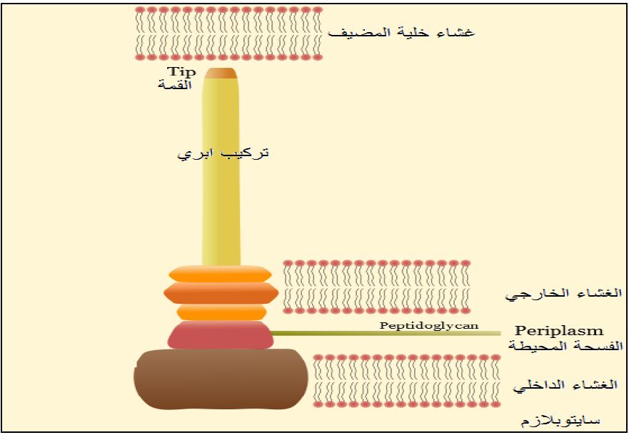 ويتألف النظام من 20 مكون تركيبي ويحتاج الى بروتينات تنظيم إضافية ووصيفات كي يكون فعالا، كما ان بعض مكوناته تشبه مكونات الاسواط. ووجد ان جينات هذا النظام توجد في جزر الجينوم Genomic Islands والبروتينات التي تفرز بهذا النظام موجودة ضمن هذه الجزر وهذا التواجد القريب على الجينوم يعد من الأساسيات للتنبؤ بالجينات المسئولة عن البروتين المفروز.