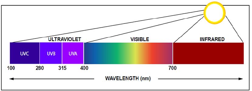 • UV C اطوالها 200 -290 نانومتر وهذه يتم حجبها بطبقة الاوزون ولا تصل الى الارض وهي Germicidal ويمكن ان تستعمل في العلاج الضوئي Phototherapy
