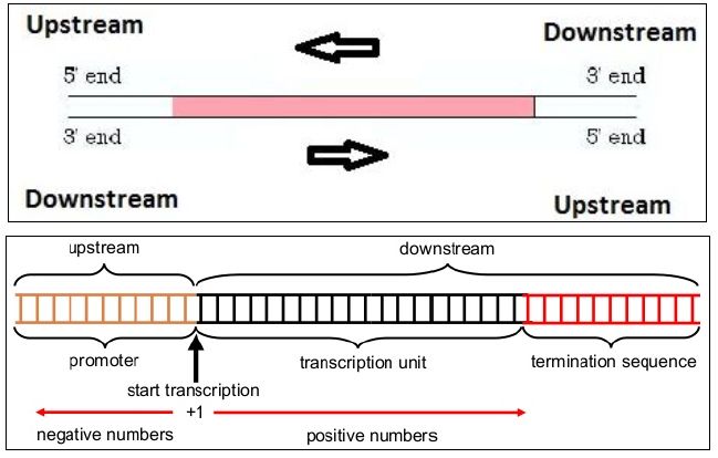 كما أن المصطلح يستعمل في الوراثة لتوضيح موقع الشفرات الوراثية اذ تكون الشفرة الاولى التي يتم انتساخها + 1 ثم التي تقع على يسارها تأخذ إشارة سالبة (للإيضاح) فقط والتي على يمينها تأخذ إشارة موجبة، وتقع الممهدات في Upstream للجينات وكذلك تضم التواليات ( 35- ، 10 -) وكذلك يقع فيها TATA box وغيرها من الشفرات.