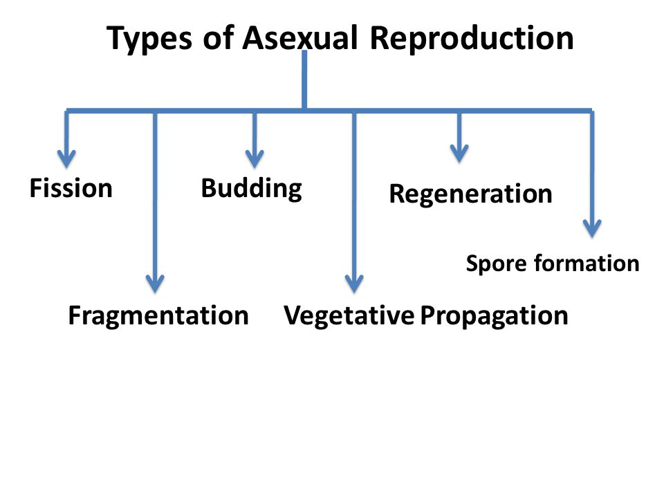 تكاثر لا جنسي يحدث في بعض الأحياء المجهرية وبعض النباتات، ففي الأخيرة يمكن أن تنتج النباتات من الدرنات أو الأبصال أو السيقان الحاوية على العقد ، أما في الأحياء المجهرية فيكون انتشاره أكثر اذ تتكاثر البكتريا بالانشطار البسيط كما تتكاثر الخمائر بالتبرعم والانشطار البسيط وتتكاثر الفطريات بالسبورات اللاجنسية أو قطع من الهايفات وتتكاثر بعض الطفيليات بالانشطار البسيط وبعض الحيوانات الواطئة يمكن أن تتكاثر بالتبرعم أيضاً مثل الهايدرا Hydra .