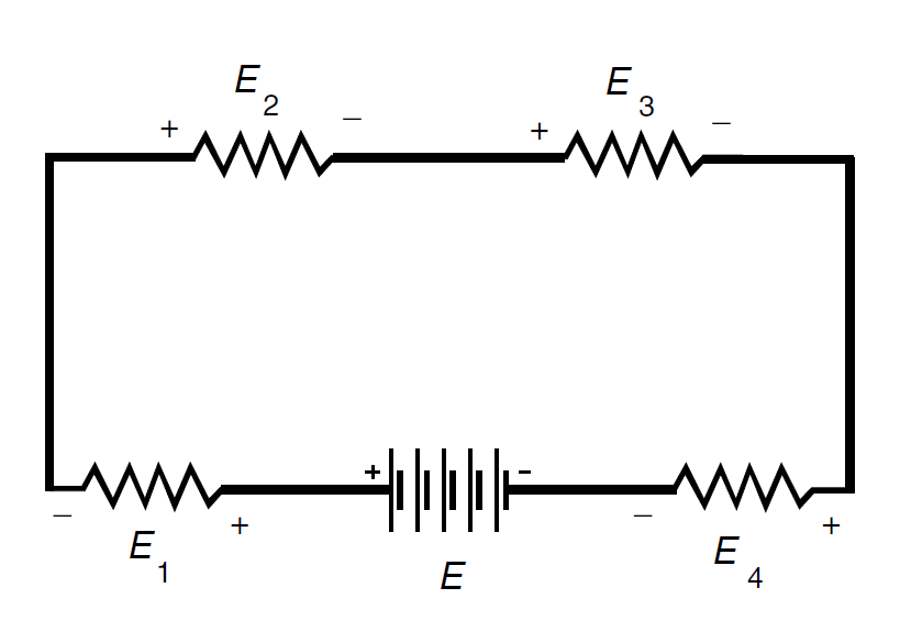 Fig. 1. Kirchhoff’s voltage law. The sum of the voltages E + E1+ E2 + E3 + E4 = 0, taking polarity into account.