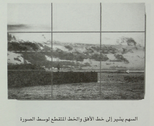 لنأخذ الصورة التالية على سبيل المثال، حيث قمنا بتقسيمها إلى تسعة مربعات كما في الشكل السابق لنجد أن المساحة الهامة فيها ليس خط الأفق كما كان يعتقد البعض (الا اذا كان خط الأفق يحتل المركز) بل المريع الذي يمر فيه الخط المركزي (الوهمي) للصورة. لذلك نرى أن الصورة تعطي الأهمية بشكل خاص للسحاب، ولجزء من الشخص الواقف. بمعنى آخر أن اللقطة لم تكن موفقة إذا أردنا أن نبرز الشخص والمنصة التي يقف عليها.