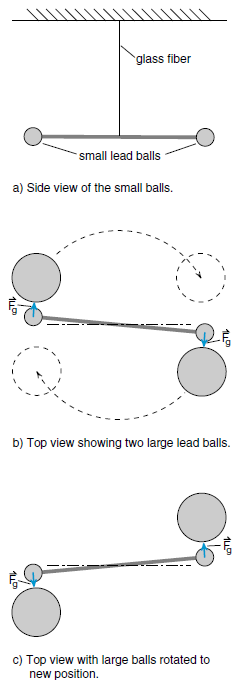 Once the rod has settled down, the large lead balls are moved to the position shown in Figure (1c). Now the gravitational force causes the rod to rotate the other way. By measuring the angle that the rod rotates, and by measuring what force is required to rotate the rod by this angle, one can experimentally determine the strength of the gravitational force