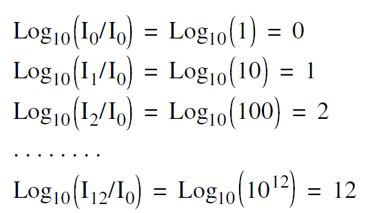 The ear and brain handle this large range of intensities by essentially using a logarithmic scale. Imagine, for example, you are to sit in front of a hi fi set playing a pure tone, and you are told to mark off the volume control in equal steps of loudness. The first mark is where you just barely hear the sound, and the final mark is where the sound just begins to get painful. Suppose you are asked to divide this range of loudness into what you perceive as 12 equal steps. If you then measured the intensity of the sound you would find that the intensity of the sound increased by approximately a factor of 10 after each step. Using the faintest sound you can hear as a standard, you would measure that the sound was 10 times as intense at the end of the first step, 100 times as intense after the second step, 1000 times at the third, and 1012 times as intense at the final step. The idea that the intensity increases by a factor of 10 for each equal step in loudness is what we mean by the statement that the loudness is based on a logarithmic scale. We take the faintest sound we can hear, an intensity I0 = 10– 12watts/m2 as a basis. At the first setting I = I0, at the second setting I1 = 10 I0 , at the 3rd setting I2 = 100 I0 , etc. The factor I/I0 by which the intensity has increased is thus