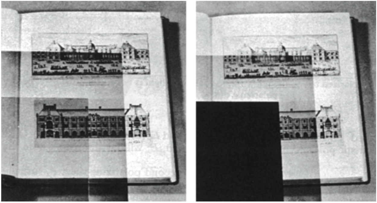 Figure 2: Light polarizers. Two sheets of polaroid are placed on top of a drawing. On the left, the axes of the sheets are parallel, so that nearly half the light passes through. On the right, the axes are perpendicular, so that no light passes through. (Photo from Halliday & Resnick)