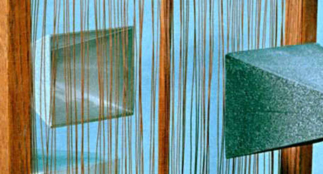 Figure 1: Microwave polarizer, made from an array of copper wires. The microwave transmitter is seen on the other side of the wires, the detector is on this side. When the wires are parallel to the transmitted electric field, no signal is detected. Rotate the wires 90 degrees, and the full signal is detected.
