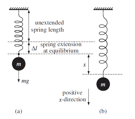 Figure 1.1 An oscillating mass on a vertical spring. (a) The mass at its equilibrium position. (b) The mass displaced by a distance x from its equilibrium position.