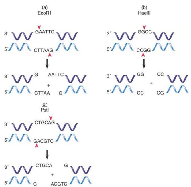 FIGURE 2. (a) A restriction endonuclease may cleave its recognition site and make a staggered cut, leaving a 5′ overhang or a 3′ overhang. (b) A restriction endonuclease may cleave its recognition site and make a blunt end cut.
