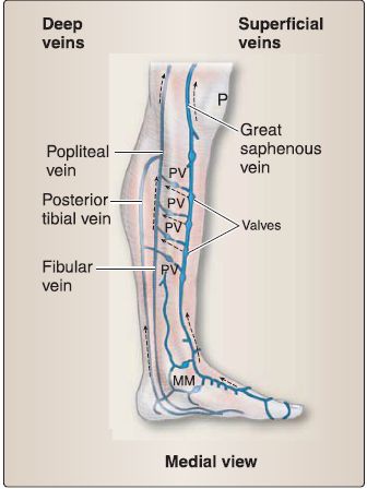 Figure 2 :Venous drainage of the lower limb. Only deep and superficial veins of the leg are shown; deep veins of the thigh (not shown) correspond in course and name to lower limb arteries. Arrows indicate direction of blood flow. MM = medial malleolus, P = patella, PV = perforating vein.