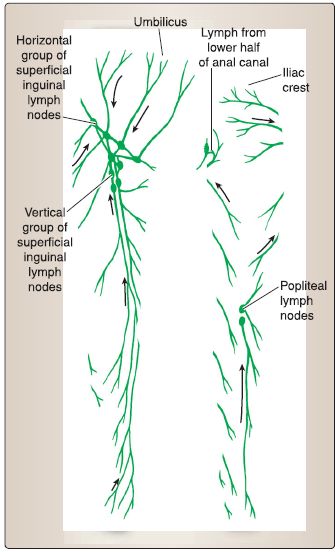 Figure 3: Lymphatics of the lower limb. Arrows indicate direction of lymph flow.