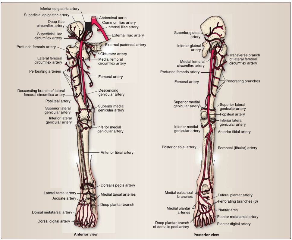 The lower limb receives arterial blood supply primarily from the femoral artery and its branches (Fig. 4). Additionally, the gluteal region is supplied by superior and inferior gluteal arteries, and the medial thigh by the obturator artery, which are all branches from the internal iliac artery system. The obturator artery also gives off a small acetabular branch to the head of the femur.