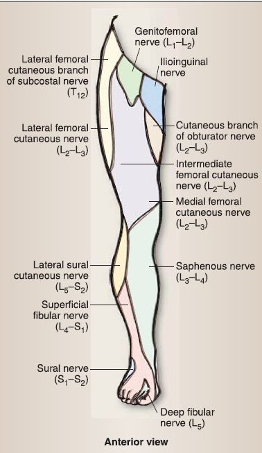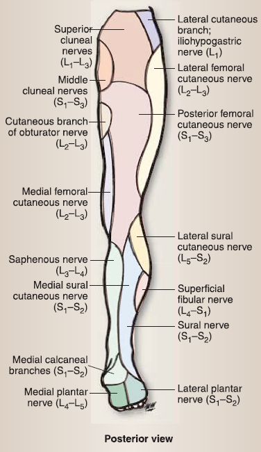 Cutaneous innervation (Fig. 6) of the lower limb is primarily relayed by branches of the main terminal nerves, as well as lateral femoral cutaneous (L2-L3), genitofemoral (L1-L2), ilioinguinal (L1), posterior femoral cutaneous (S1-S3), and