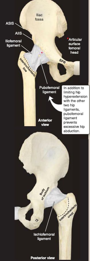 3. Ligaments: The iliofemoral ligament lies anterior and superior and prevents hyperextension of the hip. The pubofemoral ligament lies inferior and prevents excessive abduction of the hip. The ischiofemoral ligament lies posterior and is the weakest of the three. Collectively, these ligaments assist the medial and lateral hip rotators in maintaining the position of the femoral head in the acetabulum to achieve stability. The ligament of the head of femur assists in the strength of the joint as well.