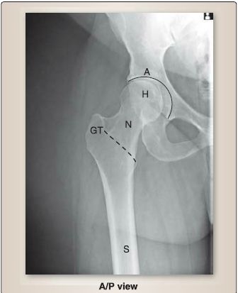 Figure 2: Plain film radiograph of normal hip (dotted line-intertrochanteric line). A = acetabulum, NP = anterior/ posterior, GT = greater trochanter, H = head, N = neck, S = shaft.