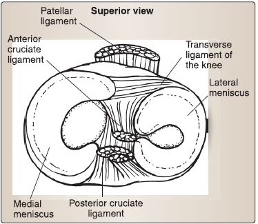 1. Cartilage: Articular hyaline cartilage lines both the femoral and tibial condyles and posterior patella. Crescent-shaped fibrocartilagenous plates called menisci (medial and lateral} are attached on the tibial articular surface to further deepen the joint surface and provide shock absorption.