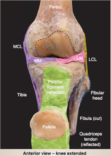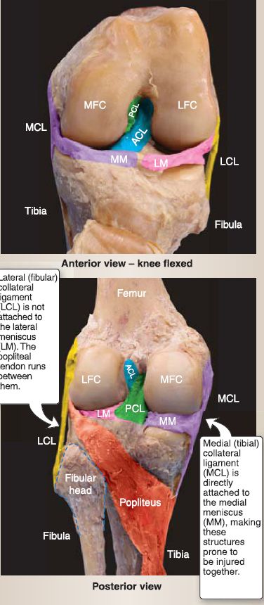 a. Medial (tibial) collateral ligament (MCL): The MCL extends from the medial epicondyle of the femur to the medial condyle and superior surface of tibia. It tightens with valgus force and is attached to the medial meniscus.