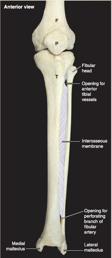 As shown in Figure 6, the tibiofibular joint is a syndesmosis fibrous joint held together by an interosseous membrane that spans between the tibial and fibular shafts as well as distal tibiofibular ligaments (anterior, interosseous, and posterior). The collection of distal tibiofibular ligaments provides additional support to maintain the integrity of the ankle joint. Trace movement occurs at the distal end of this joint during ankle dorsiflexion. Branches from the fibular artery and anterior and posterior tibial arteries supply this joint, while innervation is mediated by branches of the tibial, deep fibular, and saphenous nerves.