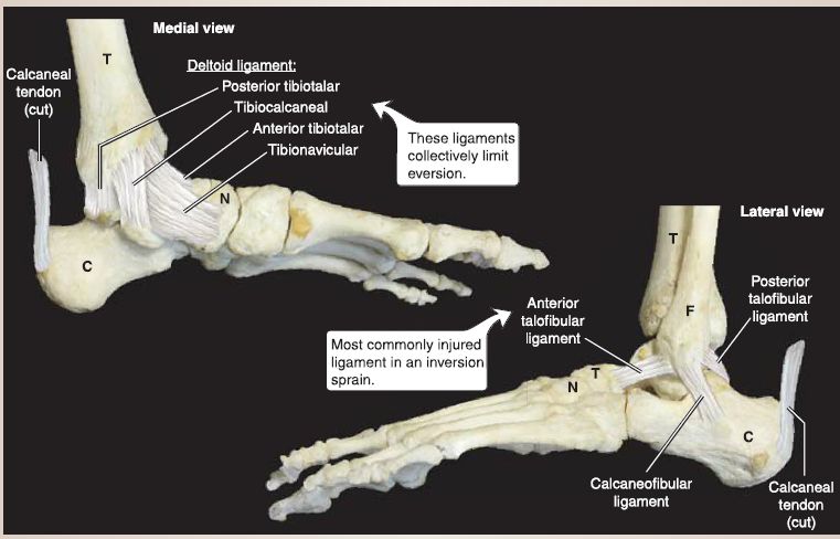 2. Ligaments: The ankle joint is supported medially by the strong fan-shaped deltoid ligament, which consists of the tibionavicular part, tibiocalcaneal part, and the anterior and posterior tibiotalar parts. This collection of ligaments resists eversion of the ankle joint. Laterally, the ankle is supported by the anterior and posterior talofibular ligaments and the calcaneofibular ligament. Collectively, these ligaments resist inversion, but they are weaker than their medial counterparts.