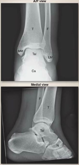 Figure 8: Plain film radiographs of normalankle. A/P = anterior/posterior, Ca = calcaneus, F = fibula, LM = lateral malleolus, MM = medial malleolus, N = navicula, T = tibia, Tai= talus.