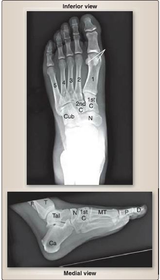 Joints of the foot are numerous and include the subtalar, talocalcaneonavicular, calcaneocuboid, cuneonavicular, tarsometatarsal, intermetatarsal, metatarsophalangeal, and interphalangeal joints (Fig. 9). Figure 10 shows plain film of the foot and bones.