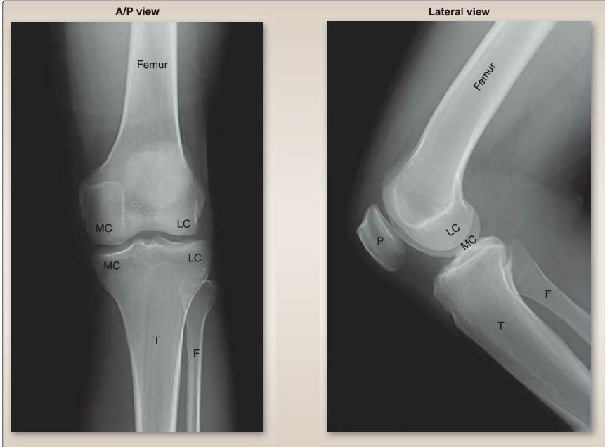 Figure 4: Plain film radiographs of normal knee joint. A/P = anterior/posterior, F = fibula, LC = lateral condyle, MC = medial condyle, P = patella, T = tibia.