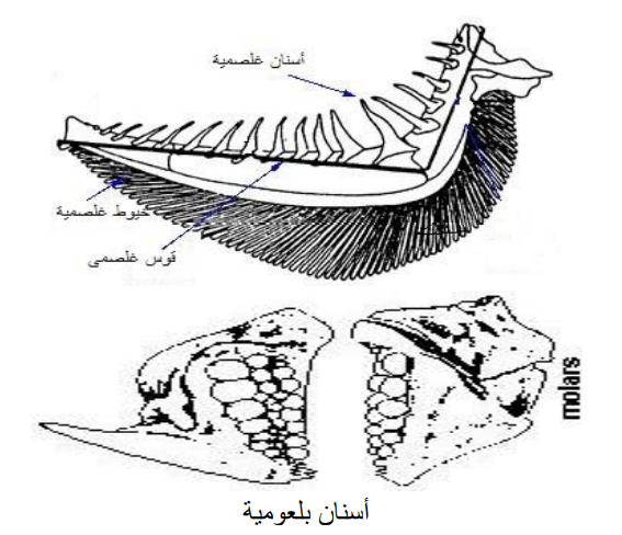 3- الاسنان البلعومية ( Pharyngeal teeth ) : أسنان تقع أسفل الصفيحة الغلصمية الأخيرة. تأخذ أشكالا وأعدادا مختلفة باختلاف طبيعة تغذي الأسماك ونوع الغذاء ومنها المشطية والساحقة والممزقة والقابضة أو الماسكة.