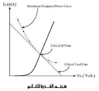 بعد رسم منحني أعلى قدرة نلاحظ أن هذا المنحني سوف يتقاطع مع منحني الخواص بالثنائي عند نقطة معينة، هذه النقطة تمثل نقطة العمل الحرجة Critical Q Point ، وأن خط الحمل الذي يرسم مماس لمنحني القدرة عند هذه النقطة Q يسمى بخعن الحمل الحرج Critical Load Line . لذلك عند تصميم دائرة ثنائي يجب عدم تجاوز هذه الخطوط الحمراء وإلا فالنتيجة سوف تكون تلف الثنائي.