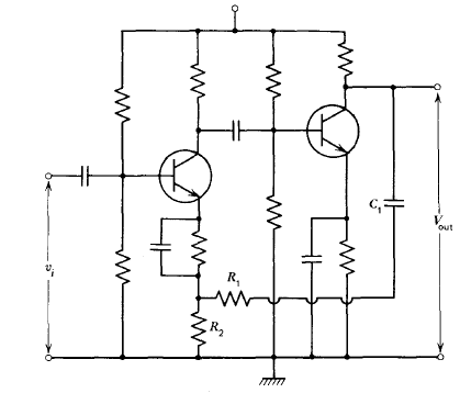 ويمكن من حيث المبدأ تحقيق التغذية الخلفية بالجهد على التوالي في مرحلة واحدة إلا أن هذا النوع من التغذية الخلفية يتم عادة بين مرحلتين أوثلاث مراحل وهناك عدة طرق لتحقيق التغذية الخلفية بالجهد بين المراحل. ويبين شكل (1) دارة مكبرمكون من مرحلتين يحتوي على تغذية خلفية سالبة بالجهد ، وتتم التغذية الخلفية السالبة في هذه الدارة بين مجمع المرحلة الثانية وباعث المرحلة الأولى خلال المقاومة R1. وتكون هذه المقاومة مع كل من المكثف C1 والمقاومة R2 دارة التغذية الخلفية بمعامل β مقداره