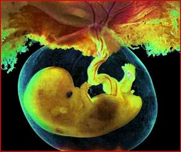 - جنين عمره 7-8 أسابيع وتظهر عليه بدايات مرحلة اللحم حيث تُكسى العظام بالعضلات ، في بداية الأسبوع الثامن تبدأ العضلات بالحركة. كما يبدأ تشكل طبقات الجلد الذي يغلف الجسم ، وانظروا معي إلى قوله تعالى : (وَانْظُرْ إِلَى الْعِظَامِ كَيْفَ نُنْشِرُهَا ثُمَّ نَكْسُوهَا لَحْمًا) [البقرة : 259]. طول الجنين الآن أقل من 3 سم في هذه المرحلة تبدأ العضلات بالتشكل ، وتبدأ هذه العضلات بتغليف العظام ، وتستمر هذه المرحلة طويلاً وتتداخل مع المرحلة التي تليها ، أي مرحلة العظام. يقول تعالى : (فَكَسَوْنَا الْعِظَامَ لَحْمًا ). أما المشيمة فتقوم بتغذية الجنين بالهواء والطعام والشراب ، ولا تسمح بمرور المواد المؤذية ، وتنتج الهرمونات التي تنظم درجة حرارة الجنين ، ويقول العلماء إن المشيمة تعمل على العناية بالجنين بشكل أفضل من أي غرف عناية مشددة ، فسبحان الله !