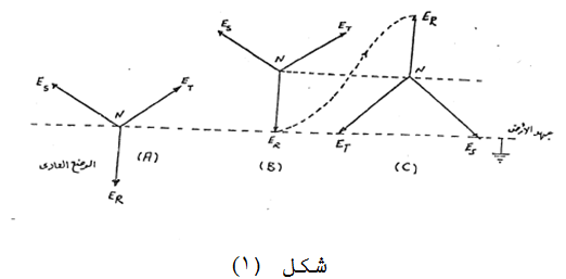 وسوف يصبح متجه الجهد للأوجه كما في شكل (C)- يلاحظ أن جهد الوجه R ارتفع من الصفر الى حوالي ضعف الجهد على الوجه بالنسبة للأرضي- هذه القيمة للجهد يمكن أن تكون كافية لانهيار الفجوة وملامستها الأرض- أي أنها تساعد على اتصال الوجه R بالأرض مرة ثانية- اذا حدث هذا فان جهد الوجه R يصبح مساوياً لجهد الأرض..