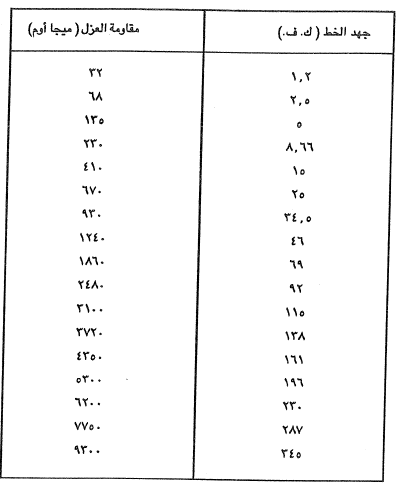 جدول رقم (1) يوضح قيمة مقاومة العزل في الزيت عند درجة حرارة 20م، المقابلة لقيمة الجهد العادي (خط / خط )