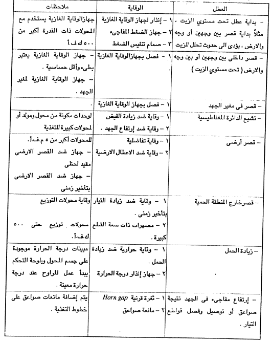 جدول (1) يوضح بعض الاعطال التي يمكن حدوثها بالمحولات وأجهزة الوقاية التي تعمل نتيجة العطل