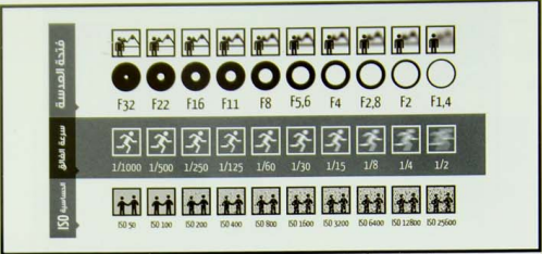 - حساسية الفيلم ( كمية الضوء التي يحتاجها الفيلم لإظهار الصورة كما ينبغي ).
