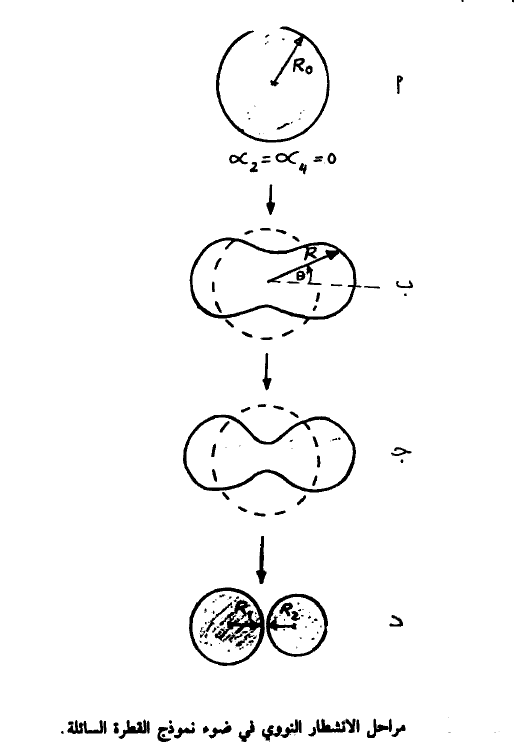 في الأنوية الخفيفة نجد أن قوة التنافر الكهربة صغيرة حيث تزداد قوة التوتر السطحي والقوة النووية وتصبح النواة كروية الشكل. أما في الأنوية الثقيلة جداً فإن كبر حجم النواة يؤدي إلى زيادة قوة التنافر الكهربي ومن ثم تستطيع هذه القوة التغلب على التوتر السطحي مما ينتج عنه انقسام أو انشطار النواة. ومن ثم فإن عملية الانشطار النووي يمكن تمثيلها بالشكل (1) حيث يبين لنا نواة كروية في البداية ثم تثار هذه النواة مما ينتج عنه بدء ظهور التشوهات فيها. وتستمر هذه التشوهات حتى تنقسم النواة في النهاية إلى نواتين مختلفتين وهذا هو الانشطار النووي. لاحظ أن الحجم النوري في جميع المراحل لم يتغير. في الشكل (أ) نجد أن النواة كروية وهنا فإن (0 = α4= α2) وبذلك فإن R = R0 في الشكل (ب) يظهر التشويه وتأخذ R العلاقة (2). في الشكل (حـ) يزداد التشويه. وهنا نصل إلى درجة عالية من الإثارة. فإذا كانت قوة التوتر السطحي ما زالت أكبر من قوة التنافر الكهربي فإن النواة قد تعود إلى شكلها الكروي الأصلي. وهنا تفقد النواة طاقة إثارتها بإطلاق الإشعاع النووي (جسيمات α, γ, β إلخ). أما إذا أصبحت قوة التوتر السطحي أصغر من قوة التنافر الكهربي سوف تنجح هذه الأخيرة في نقل النواة إلى المرحلة (د) حيث يتم انقسام النواة إلى نواتين أصغر منها.