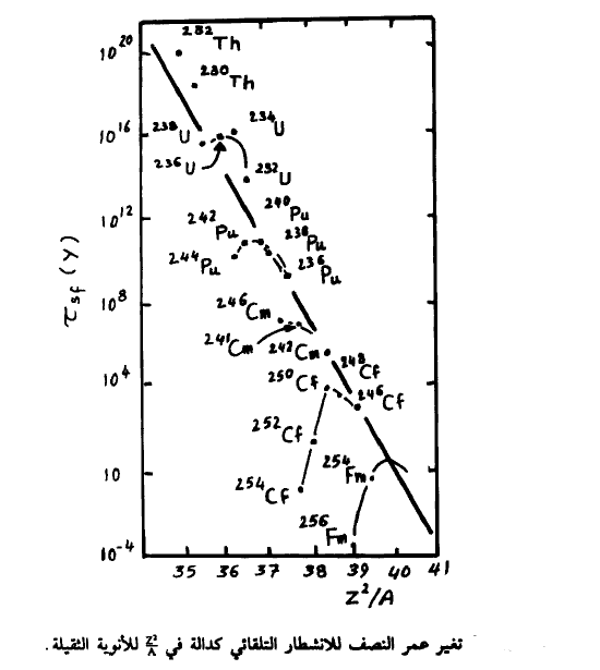 كما يمكن ملاحظة أن الأنوية التي ستنشطر تلقائياً وآنياً والتي تخضع للعلاقة (11) هي تلك التي تتمتع بعدد ذري 140 < Z وعدد كتلة 390 < A.