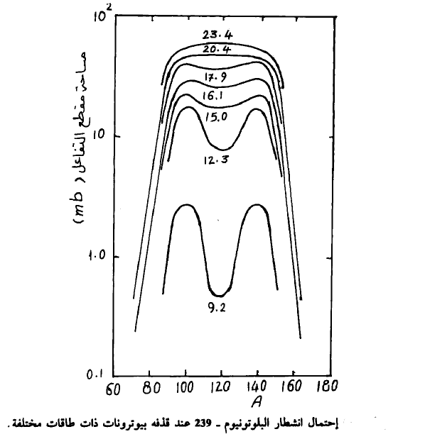 لقد وجد أيضاً أن الأنوية الثقيلة يمكنها هي الأخرى الانشطار عند قذفها بالجسيمات المشحونة. وقد تمت دراسة منتوج الانشطار لنواة Pu239 عند قذفها بالديوترونات بطاقات مختلفة وتبين أن منحنى المنتوج يعتمد على الطاقة كما يبين ذلك الشكل (2). حيث نجد أنه عند الطاقات المنخفضة فإن شكل المنتوج يتميز بوجود قمتين واضحتين تمثلان شظيتي انشطار أحدهما ثقيلة والأخرى خفيفة وهي السمة التي بيناها في الشكل (1). أما القاع المبين بالشكل فيمثل الانشطار المتماثل حيث تنطلق شظيتان متماثلتا الكتلة. وعندما تزداد طاقة الديوترونات فإن هذا القاع يأخذ في الارتفاع تدريجياً حتى يختفي نهائياً. ويأخذ الشكل منحنى ذا قمة واحدة تمثل انشطاراً متماثلاً (عند طاقات أعلى من 20.4 م.أ.ف. كما بالشكل 2).