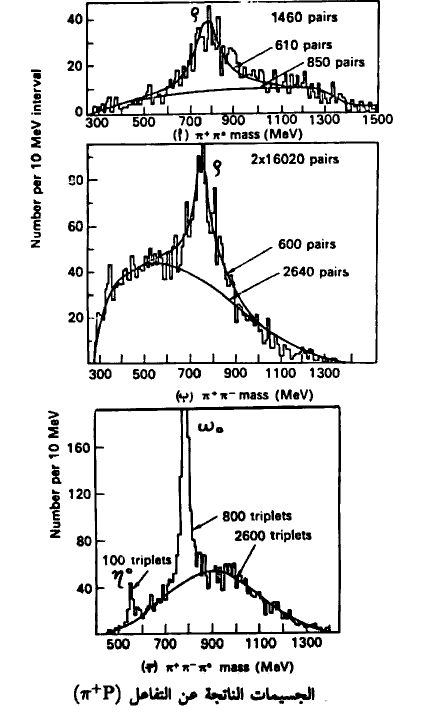 السابقة. حيث نجد في الشكل (2. أ) توزيعات الكتل للزوج +Δo ،Δ الناتجة عن المعادلة (1). وفي الشكل (2. ب) نجد توزيعات الكتل للزوج +π-، π الناتجة عن المعادلة (2). أما في الشكل (2. ج) نجد توزيعات الكتل للثلاثي π+، π-، πo الناتجة عن المعادلة (4). في الشكل أ، ب يتكون جسيم يعرف بميزون (ρ), أما في الشكل (جـ) فنجد قمة تمثل الجسيم (oW) عند (800 م.أ.ف.) وقمة أخرى تمثل الجسيم (ηo) عند حوالي (580 م.أ.ف.).