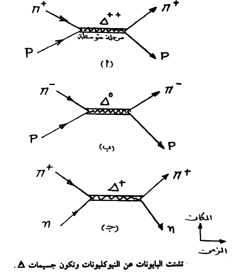 وقد وجد أن كتل هذه الجسيمات (Δ) تساوي 1.23 (ج.أ. ف.) كما وجد تكون عدة حالات إثارة من هذه الجسيمات بزيادة طاقة البايونات حيث اكتشفت قمم عند طاقات تساوي: (1.67)، (1.9) ج. أ. ف نبين في الشكل (1) تشتت البايونات عن النيوكليونات وتكون الجسيمات الرنينية (Δ).