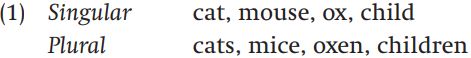 Although the vast majority of nouns pluralize in English by adding -s (or in terms of sounds, one of the variants [s], [z], or [ǝz]), some nouns form their plurals irregularly. We will return to the issue of regular versus irregular inflections shortly. In English, it is required to mark the plural on nouns in a context in which more than one of that noun is being discussed (I have six beagles). This is not the case in all languages, as our Mandarin Chinese example illustrated.