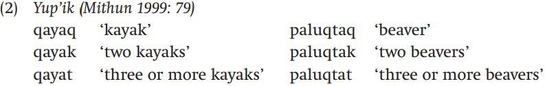 Some languages distinguish a third category of number in addition to singular and plural. For example, in the Eskimo-Aleut language Yup’ik, nouns inflect not only for singular and plural, but also for what is called dual. This is a number-marking that means ‘two’: