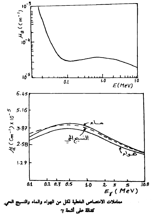 والماء والنسيج الحي كدالة في طاقة أشعة γ، يتضح من الشكل (1. أ) أن aμ ثابتة تقريباً بين القيمتين (3، 3.87)× 10-5 لكل سم. وذلك لطاقات أشعة γ المتراوحة بين 1، 10 م. أ. ف. ومن ثم يمكن حساب جرعة الامتصاص بوحدات الرونتجن (أو الراد في حالة أشعة X أو أشعة γ) أن امتصاص رونتجن واحد يؤدي إلى امتصاص 0.87 جول لكل كيلوجرام من الهواء، ويمكن تحويل هذه الوحدة إلى م.أ.ف./سم3، حيث نجد أن: